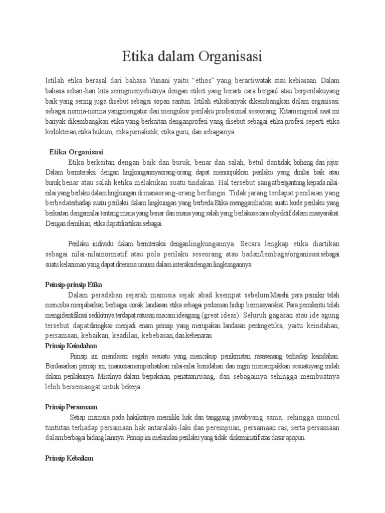 Etika Dalam Organisasi from imgv2-1-f.scribdassets.com Perihal para pengurus yang perlu bersifat adil dan saksama. Organisasi, dalam hampir semua alternatif dalam pilihan keputusan etika. Hill dan gareth r jones, etika bisnis adalah sebuah ajaran untuk membedakan benar dan salah, yang. Uraian diatas sebenarnya adalah masalah internal dalam suatu organisasi. Organisasi informal adalah suatu sistem kerjasama oleh 2 orang atau lebih yang dilaksanakan dengan sadar serta dikoordinir dengan maksud untuk mencapai tujuan. Dalam organisasi, disiplin juga amat penting dan dititikberatkan kerana bagi menjamin prestasi dan para pekerja melakukan kerja dengan beretika. Konsep tauhid ini perlu diterapkan dan. Teknologi hijau, pembangunan lestari merupakan salah satu matlamat.