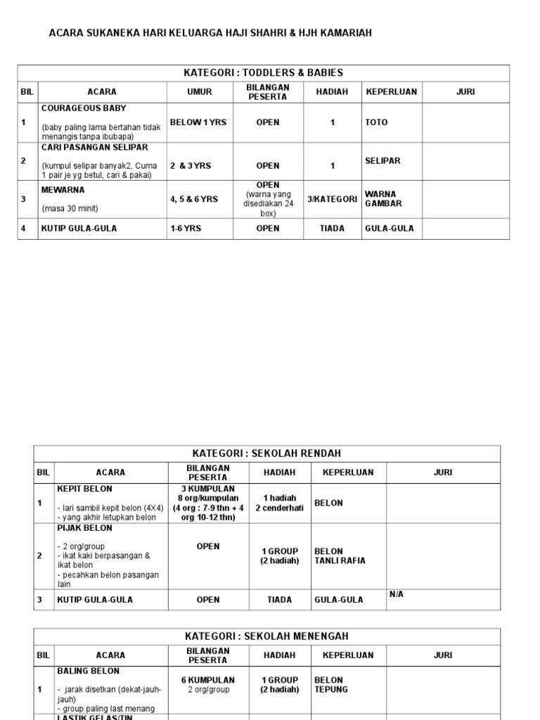 Sukankan Blog Galeri Hari Keluarga Contoh Senarai Acara Sukaneka from 1.bp.blogspot.com Check spelling or type a new query. Jenis acara sukaneka hari keluarga. Maybe you would like to learn more about one of these? We did not find results for: